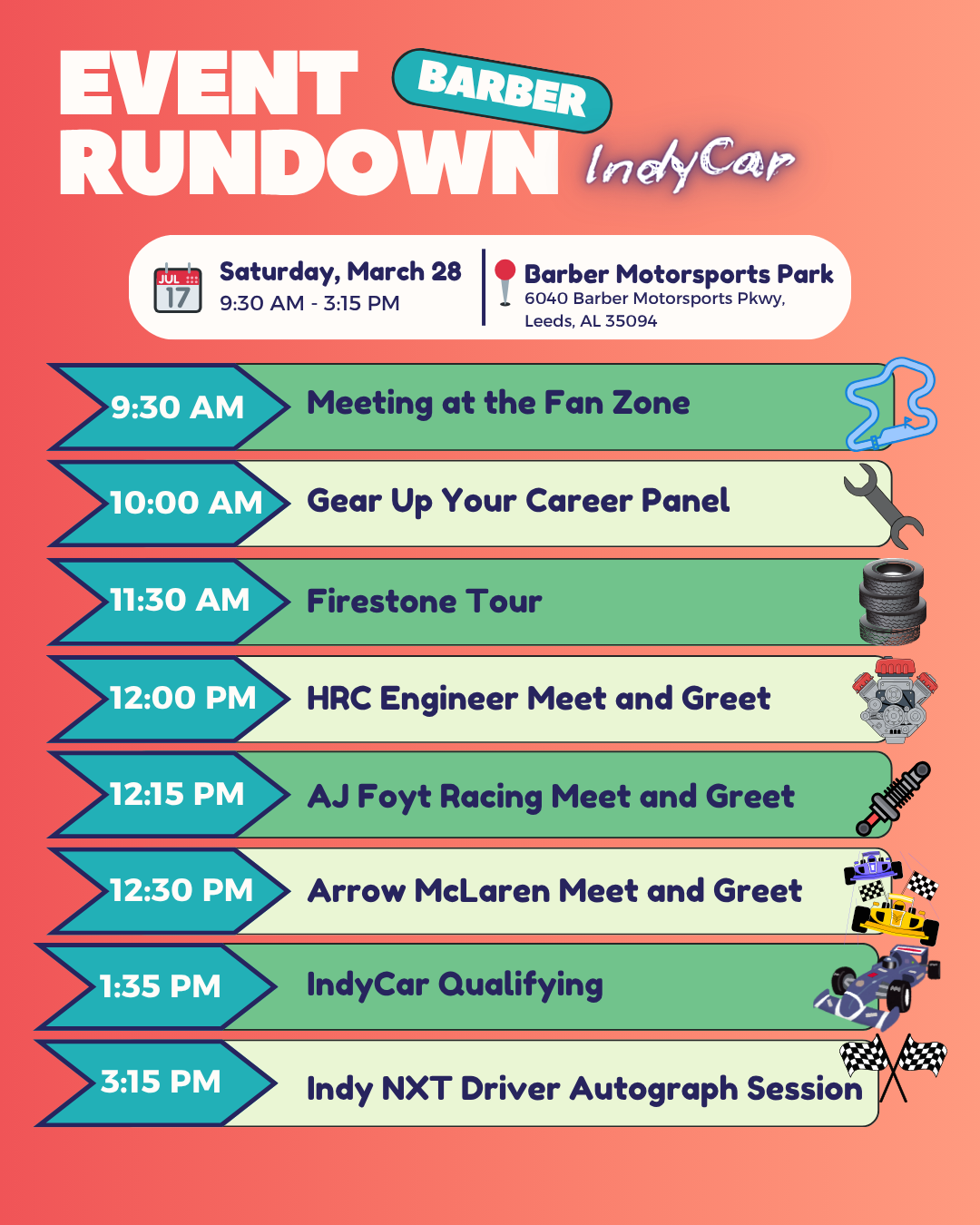 We can’t wait to have you back on the track! In the meantime, have a look at our schedule for Saturday: we are going to start the day off with a Gear Up Your Career panel, an exciting tire tour with our partner Firestone, and then meet and greets some teams and drivers, where we will be chatting with different engineers across the IndyCar and Indy NXT paddock!